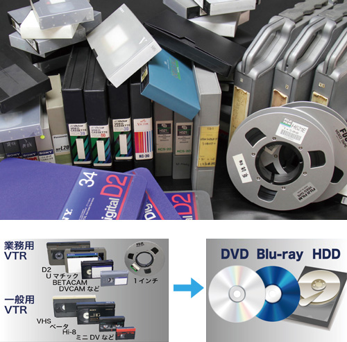 本サービスはDVDやVHS、miniDVといった一般用メディアに記録された映像を始め、HDカム、D2、Uマチック、BETACAMといった業務用の様々な種類の映像素材をノンリニア編集向け映像素材への変換を行っております。